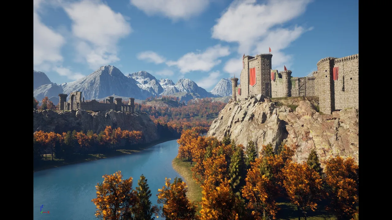 The final level presents a vibrant river valley with autumnal forests and two contrasting castles—a majestic stronghold and a weathered cliffside ruin. Lumen lighting and PBR materials deliver realistic reflections and shadows, while modular construction keeps the scene performant. This project sharpened my UE5 environment pipeline skills and stands as a portfolio-ready example of real-time world-building.